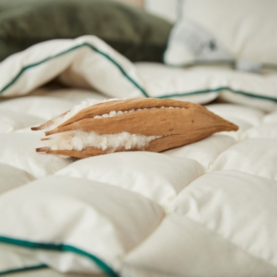 Kapokdyner og -puder er fyldt med ubehandlet kapok, med et vår af 100% økologisk certificeret bomuld.