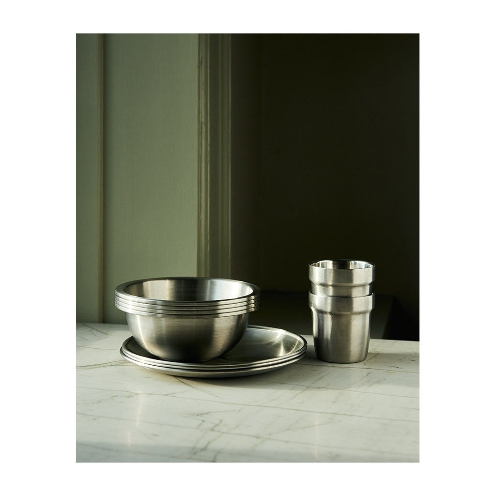 4 stål kopper med termoeffekt, lavet i fødevaregodkendt 18/8 rustfrit stål og tåler opvaskemaskine.