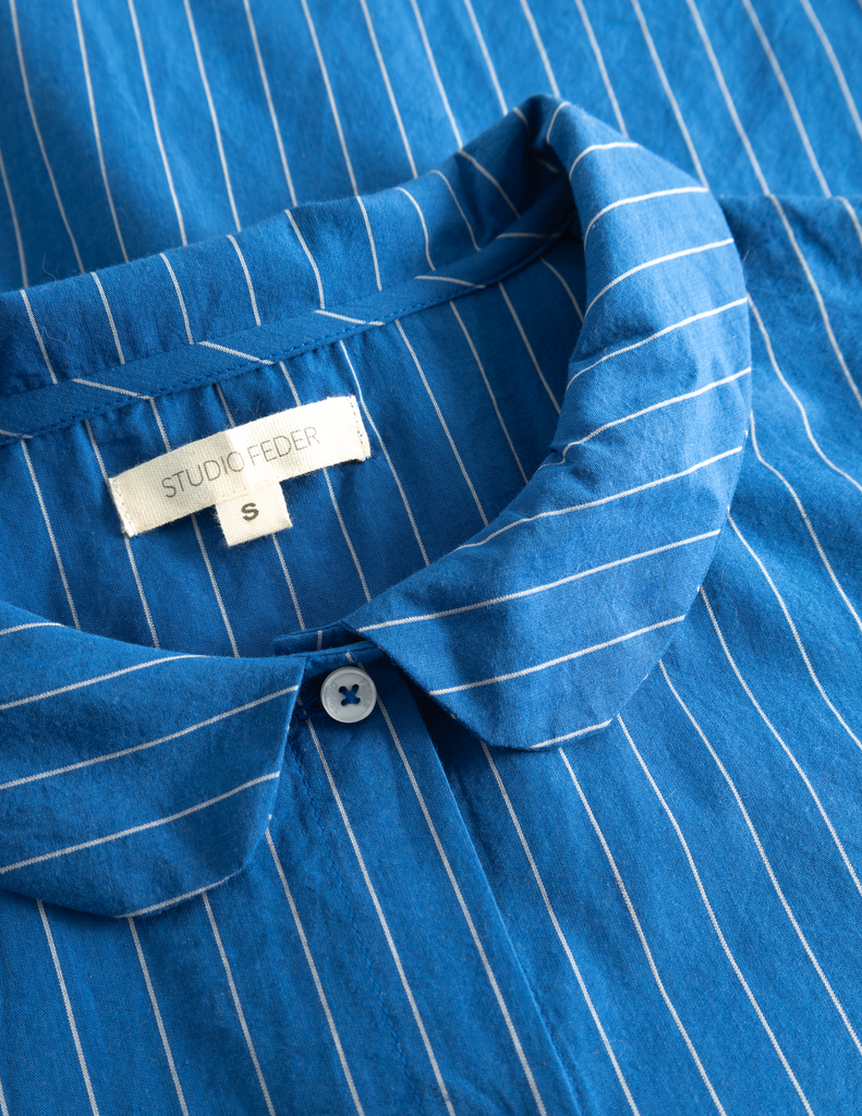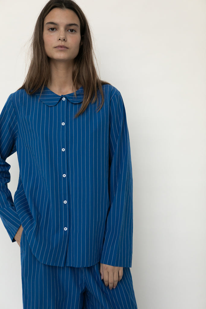Ekstremt lækker pyjamas fra danske Studio Feder i modellen Frida i klar blå med en helt tynd grå stribe