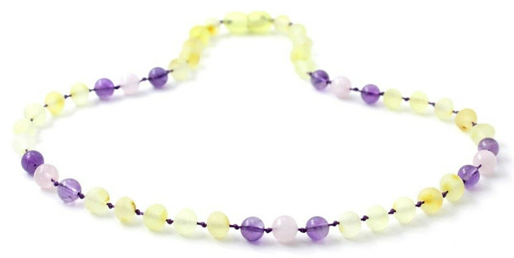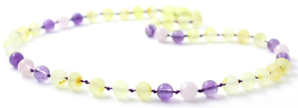 Smuk og fin halskæde til baby og børn som består af upoleret rav i lemon sammen med rose quartz & amethyst