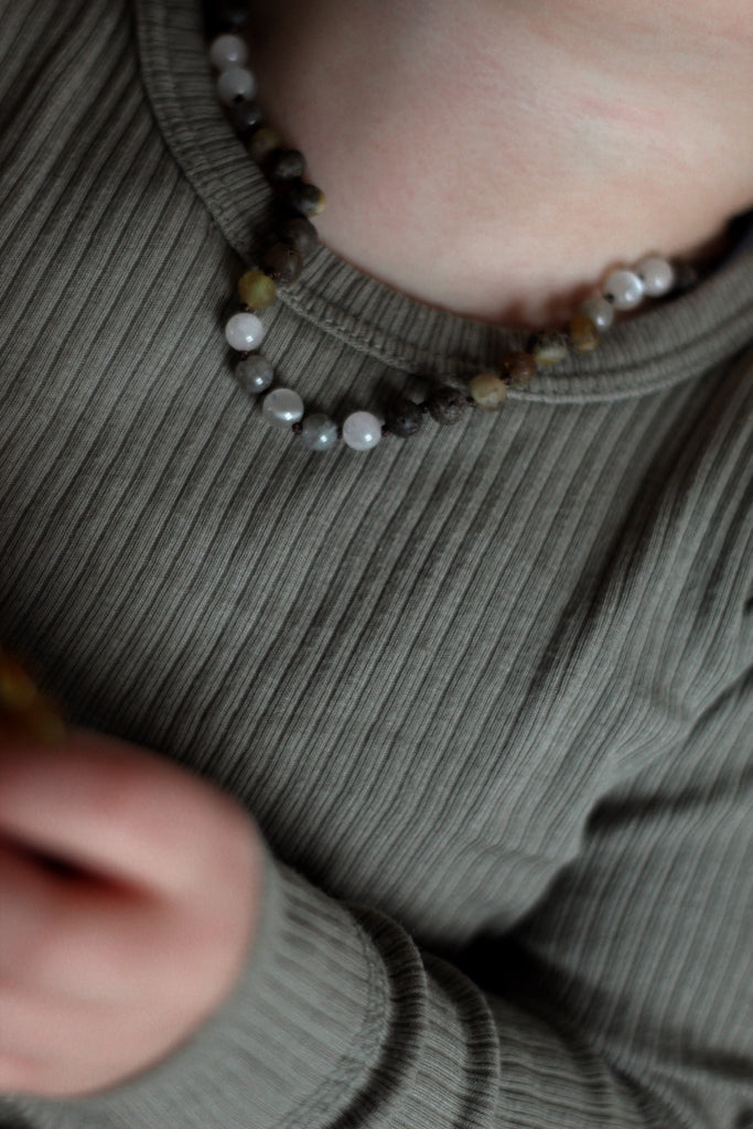 rav halskæde - større børn - rav/månesten/pale rose quartz & smokey quartz