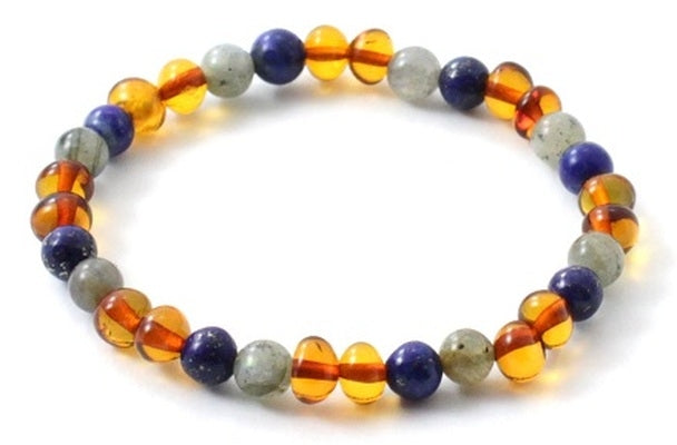 rav armbånd - voksen - poleret rav-labradorite & lapis lazuli - 18 cm.