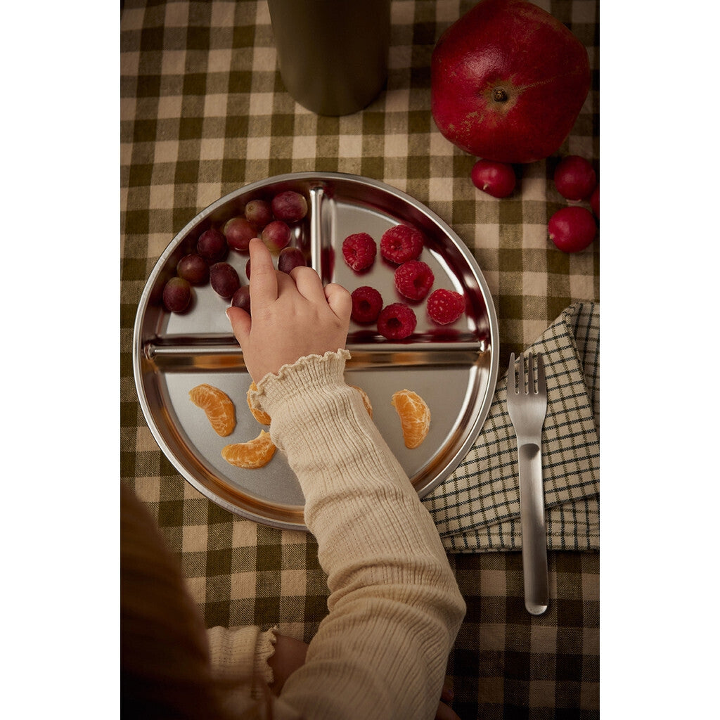 Fin og meget anvendelig tallerken i stål fra danske Haps Nordic.