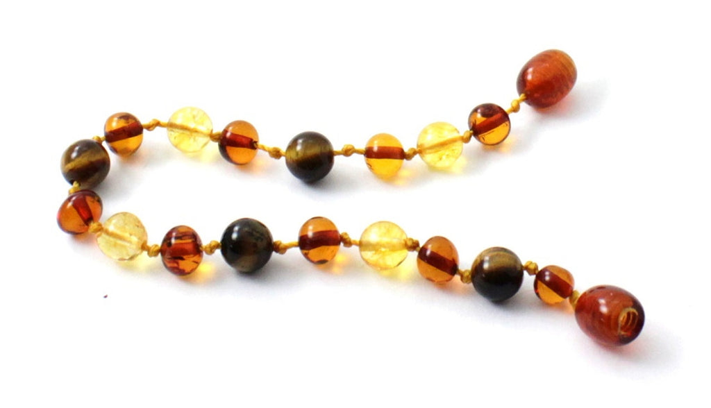 Smukt lille armbånd til baby og børn i poleret rav i cognac farven sammen med tigerøje og citrin