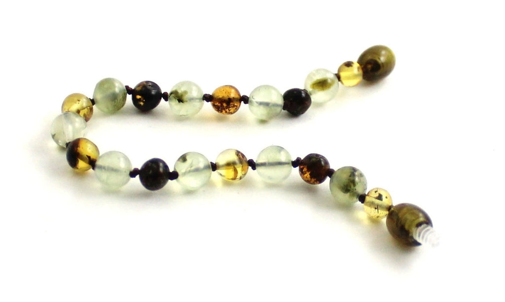 Smukt lille armbånd til baby og børn i poleret rav i grønlige nuancer sammen med prehnit