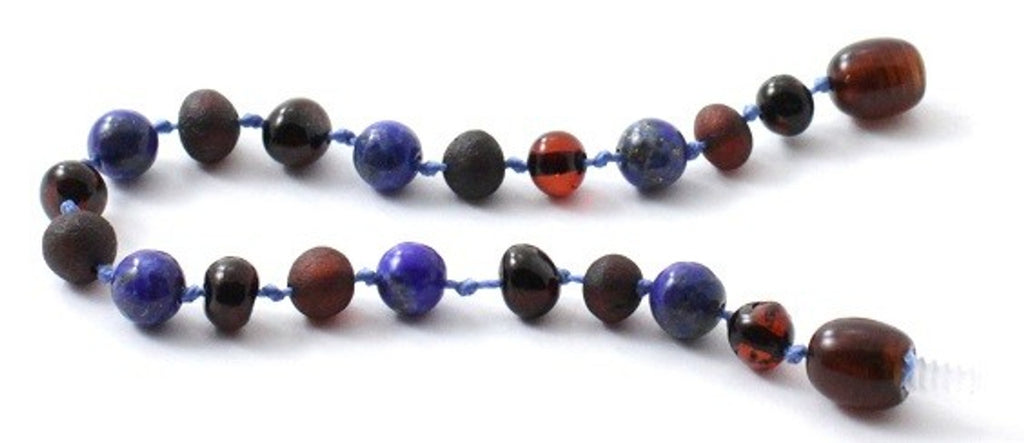 Smukt lille armbånd til større børn i mat & poleret rav i farven cherry sammen med den smukke blå lapis lazuli