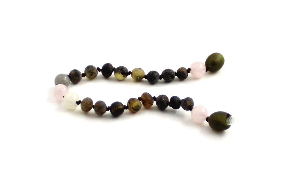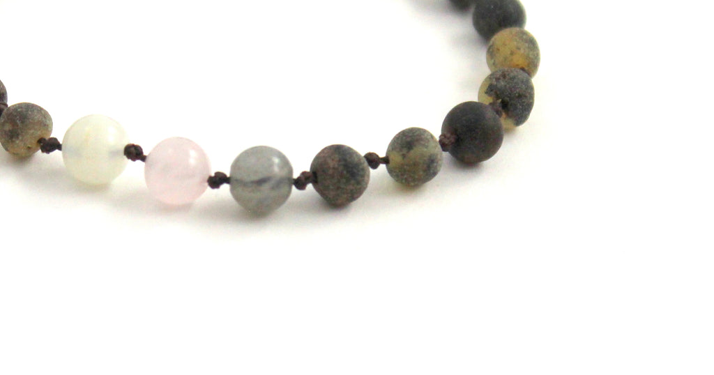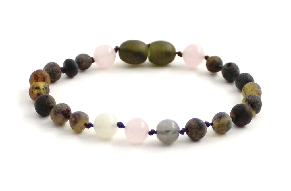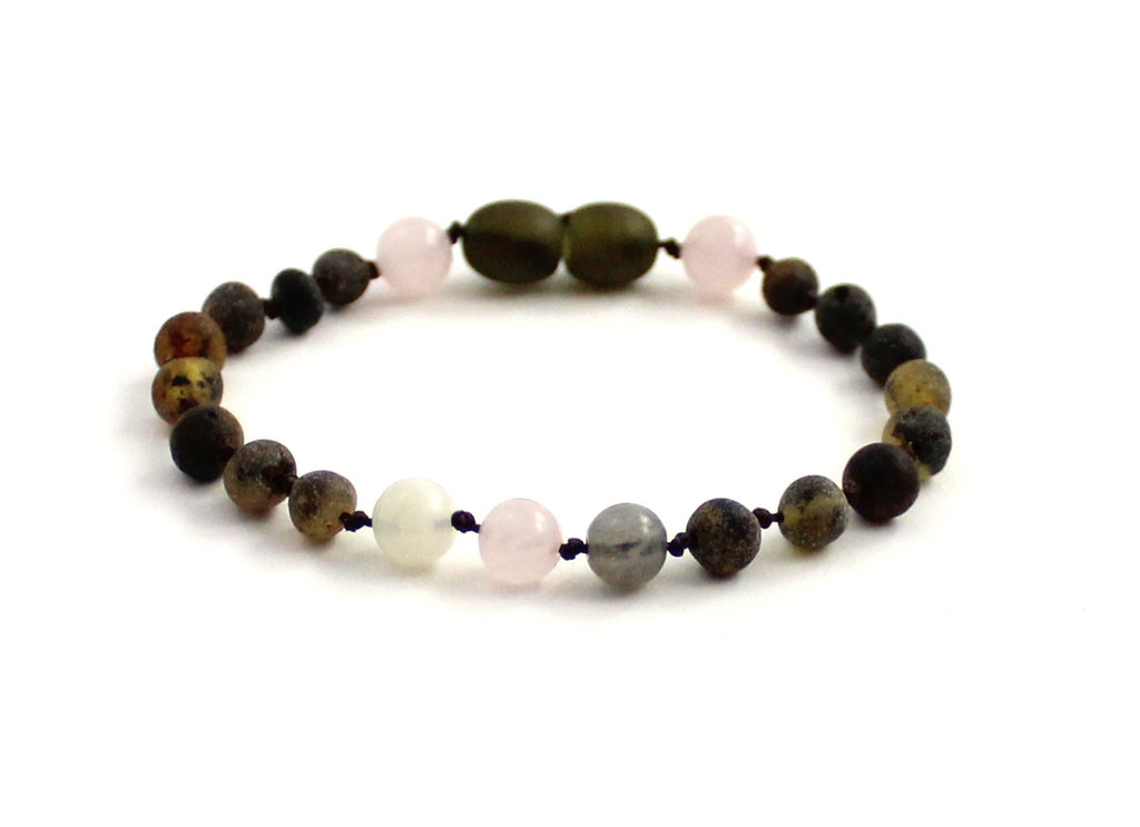 rav armbånd - større børn - rav/månesten/pale rose quartz & smokey quartz