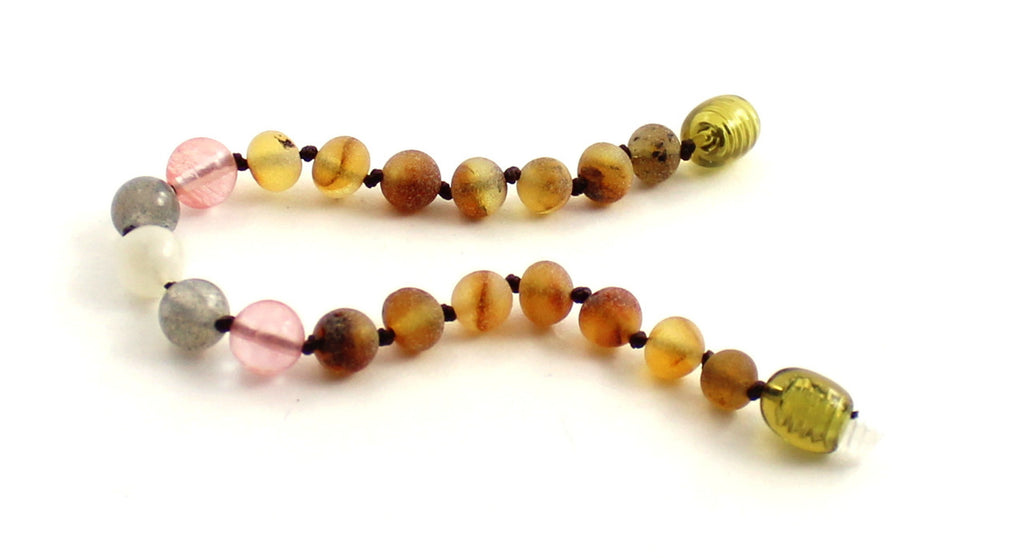 rav armbånd - større børn - rav/månesten/rose quartz & smokey quartz