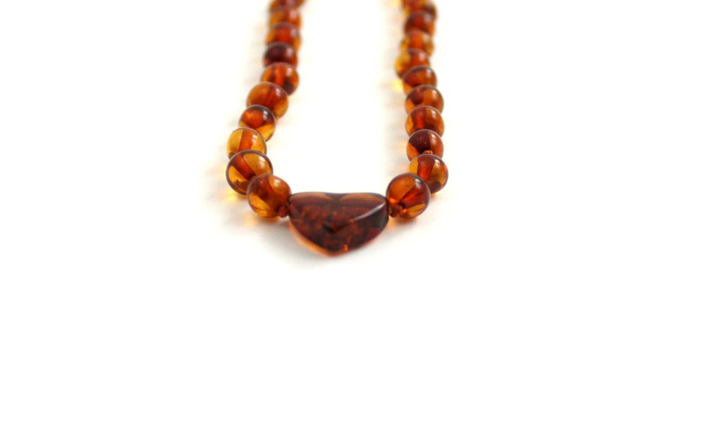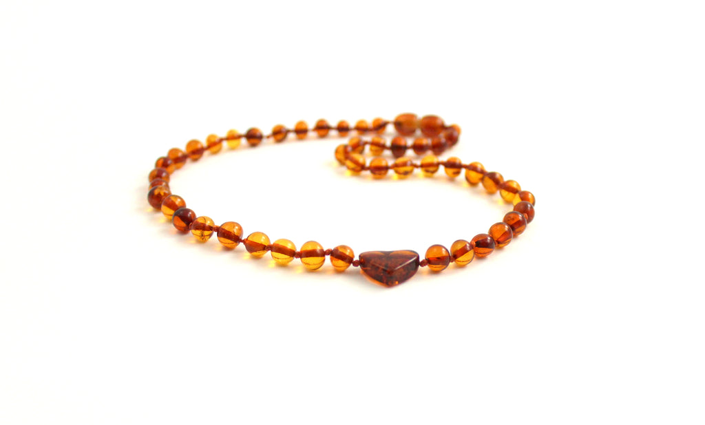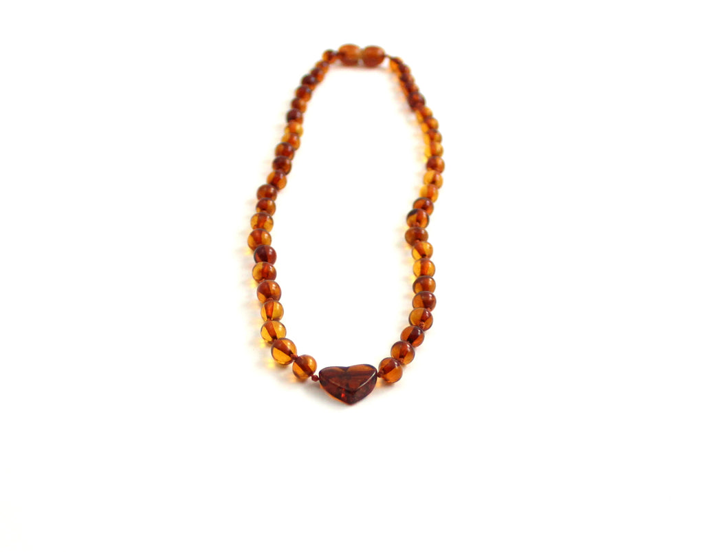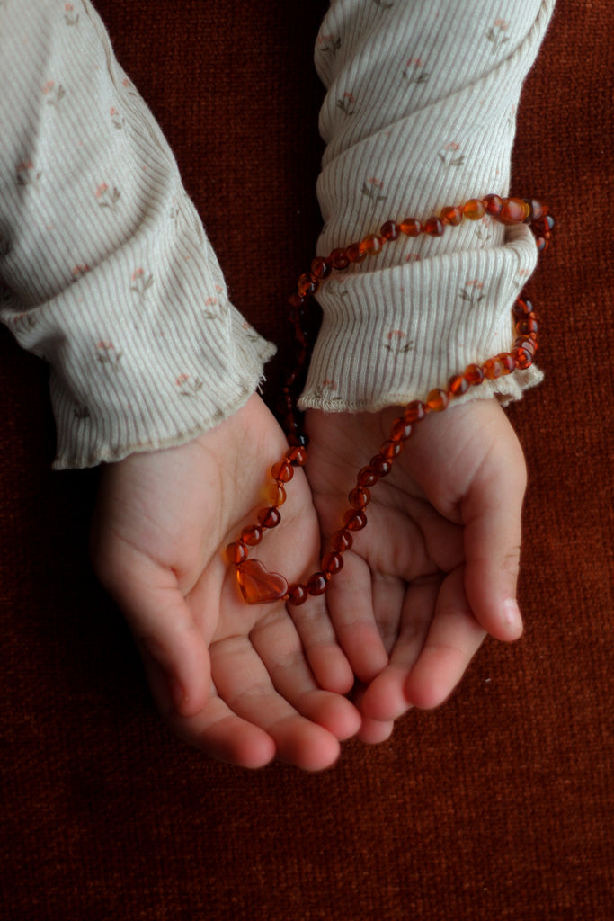 Virkelig fin halskæde i små afrundede stykker rav med et hjerte til baby og børn.