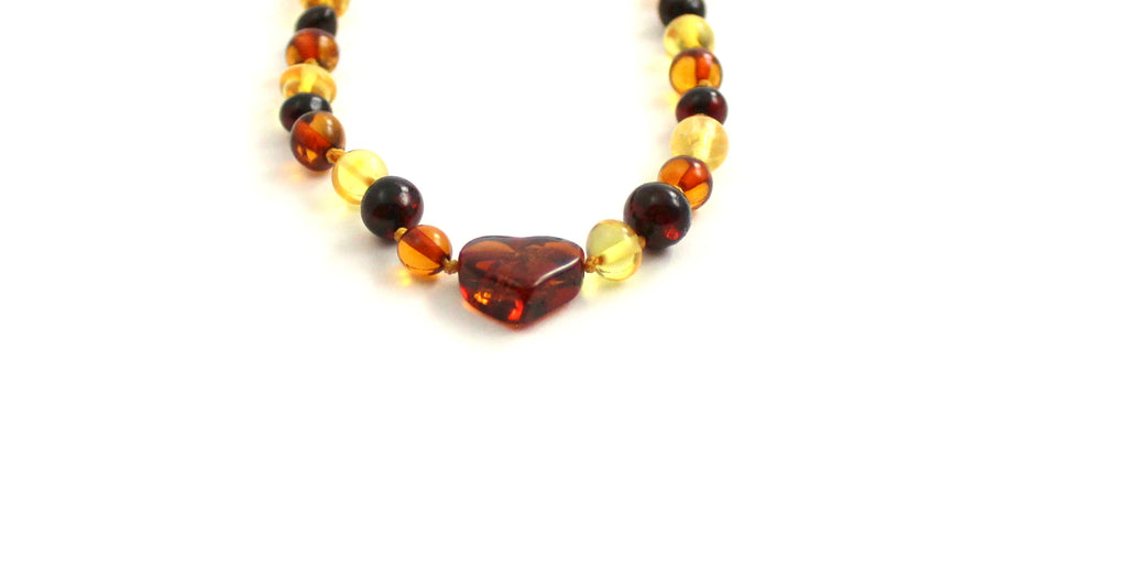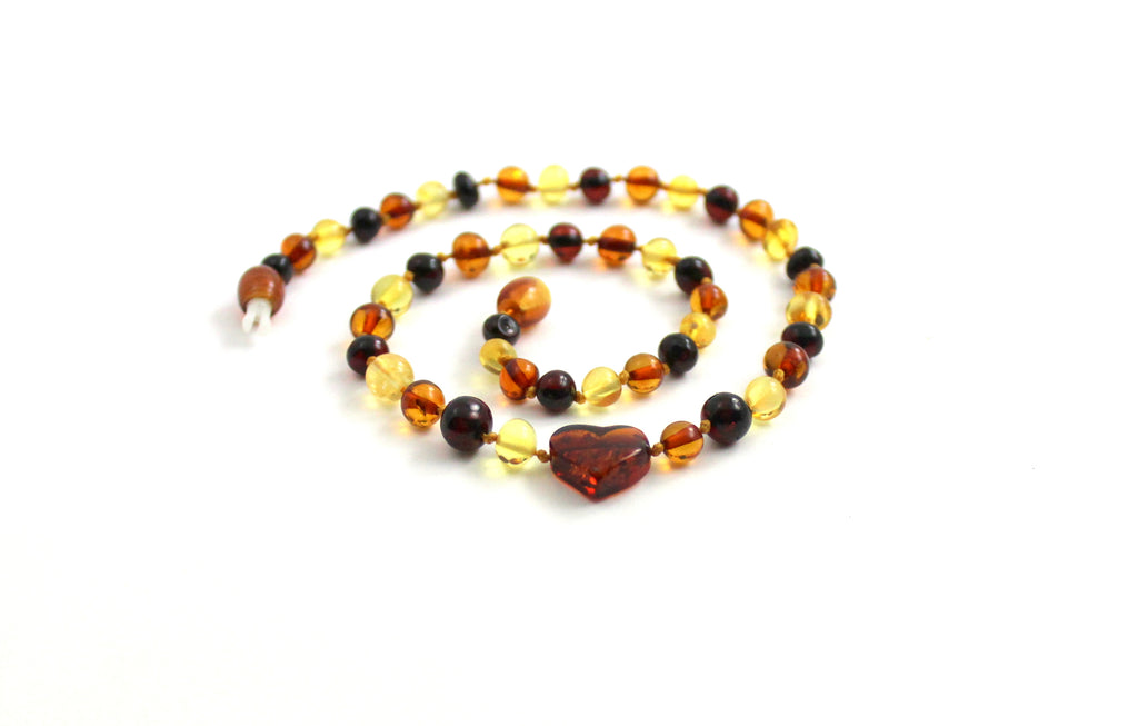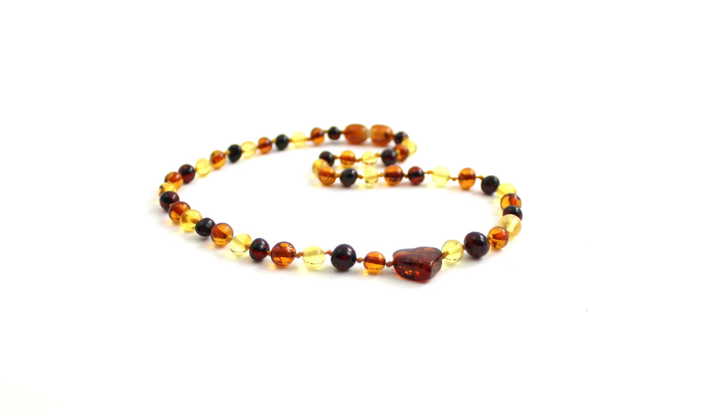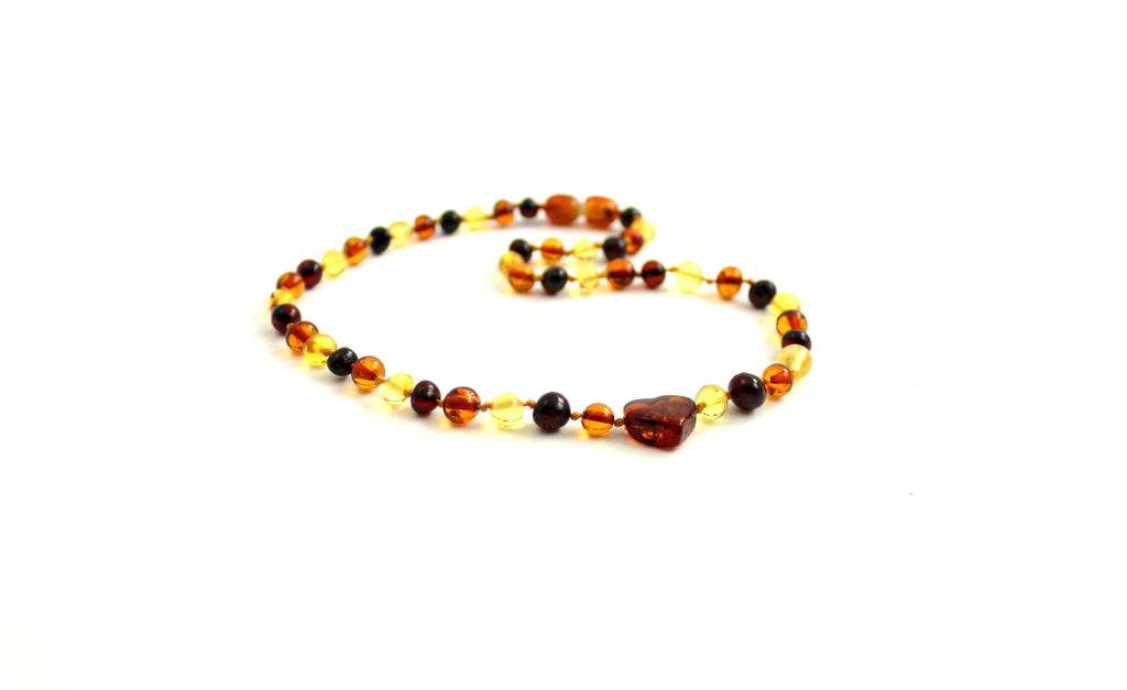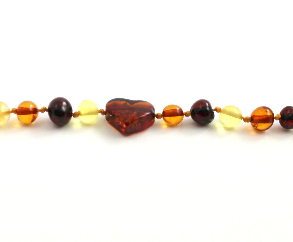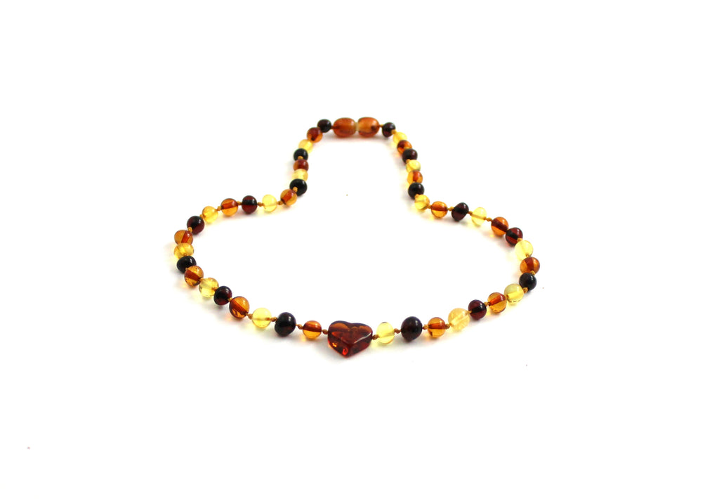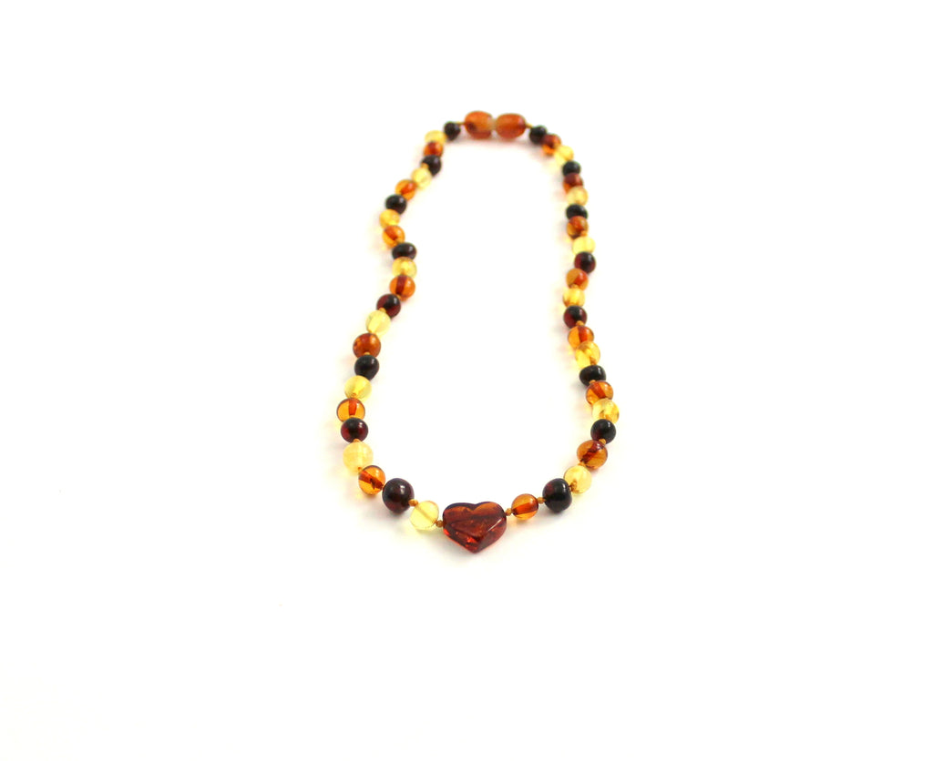 Virkelig fin halskæde i små afrundede stykker poleret rav i flere farver med et hjerte til baby og børn.