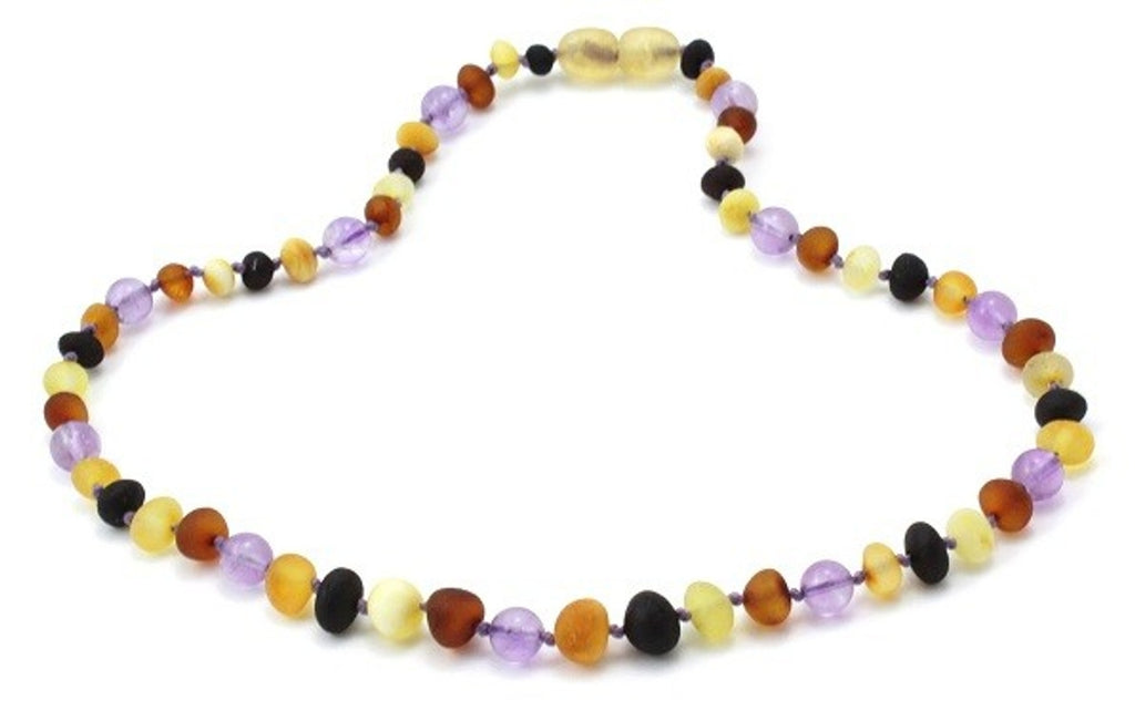 Fin halskæde i små afrundede stykker raw multi sammen med poleret amethyst