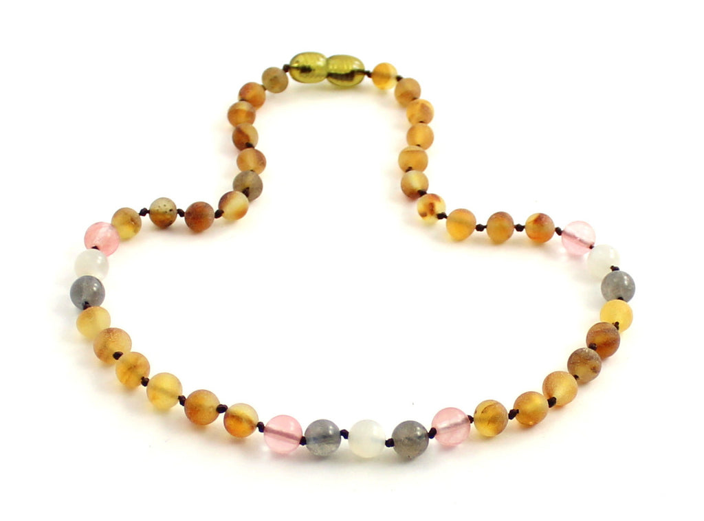 Rav halskæde - større børn - rav/månesten/rose quartz & smokey quartz